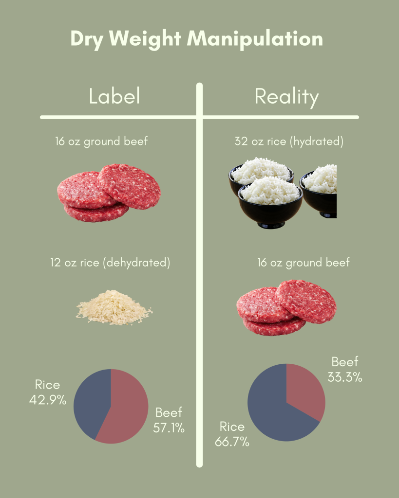 Dry Weight Manipulation is when an ingredient (like rice) is listed in its dry, uncooked form on a label. Rice should be measured and weighed in its wet form, after cooking. When it’s measured before, it will make it appear as if the carbohydrate content is lower than is actually present. As shown under the “Reality” section of Image 1, the rice (when RE-hydrated) makes up the majority of the weight in the food (66%).
