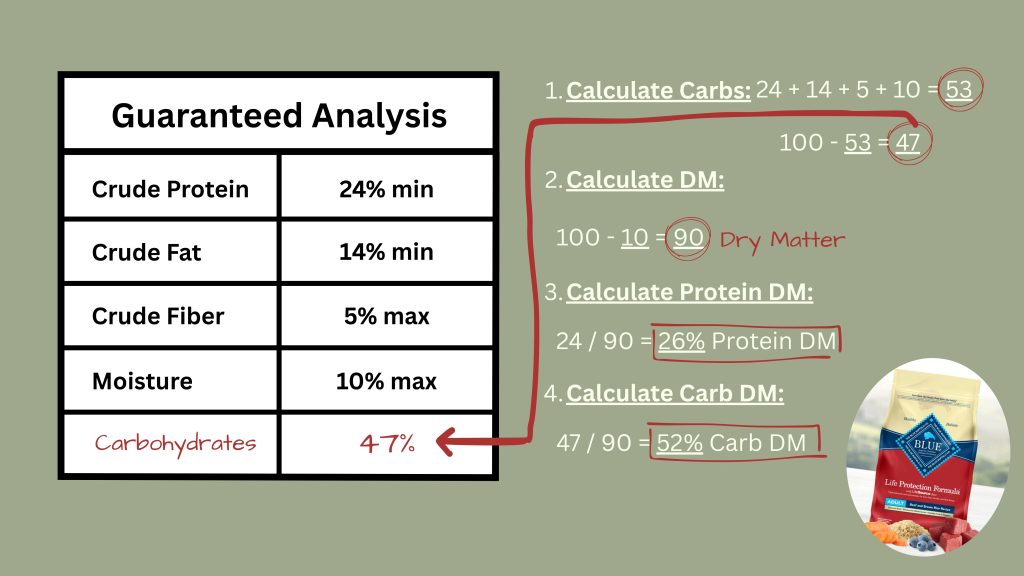 Below I have provided an example. You’ll notice that depending on the type of food, the carbohydrate percentage can look wildly different – that is until you convert everything to a Dry Matter basis: