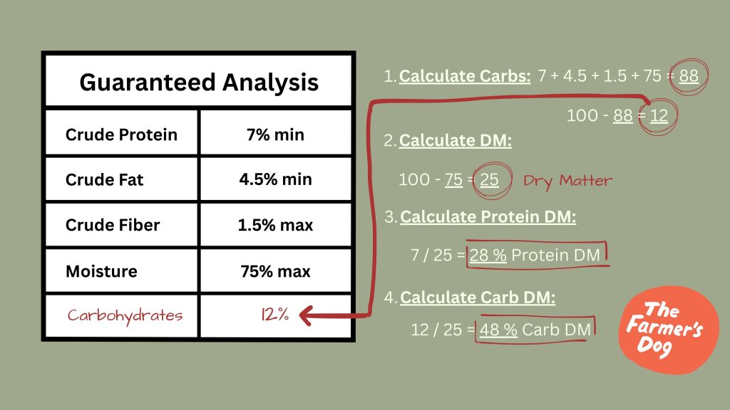 1. To accurately compare the protein and carbohydrate percentage of a food, you first need to calculate the carbohydrate percentage. Note: Carbohydrate percentage is not currently a required value that companies need to list. However, AAFCO will begin requiring carbohydrate percentages listed come 2029. Calculating carbohydrates is simple: