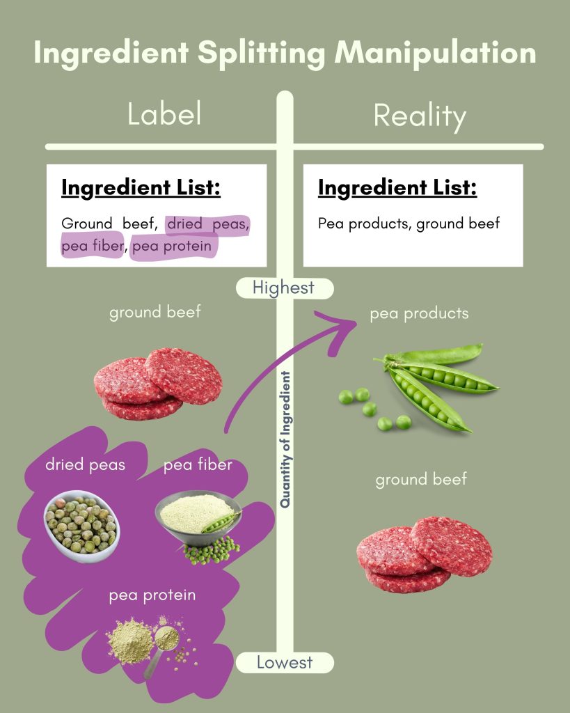 Image 2: “Ingredient Splitting Manipulation” Ingredient Splitting Manipulation is when multiple forms of a single ingredient are listed separately. In this example 3 forms of pea or pea by-products are listed (left). Since each form of pea weighs less than the total amount of beef, they are listed below beef on the label. But the total weight of pea derived ingredients is likely more than the total weight of beef in this formula.